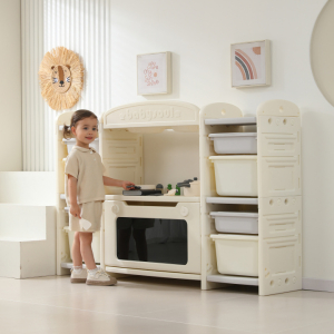 Мы на зоне спорта купили этот очень классный стеллаж, который является еще и игровой кухней, детям очень интересно играть тут. Сразу достигли две цели - и пространство организовали, хранение игрушек теперь не беспорядочное, и поиграть детям есть где. Купили все дополнительные элементы, здорово получилось!